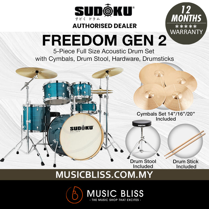 Sudoku Freedom G2 Acoustic Drum Full Size Acoustic Drum Set with Cymbals, Drum Stool, Hardware, Drumsticks - Hairline Blue (FREEDOMG2-HB-P1)