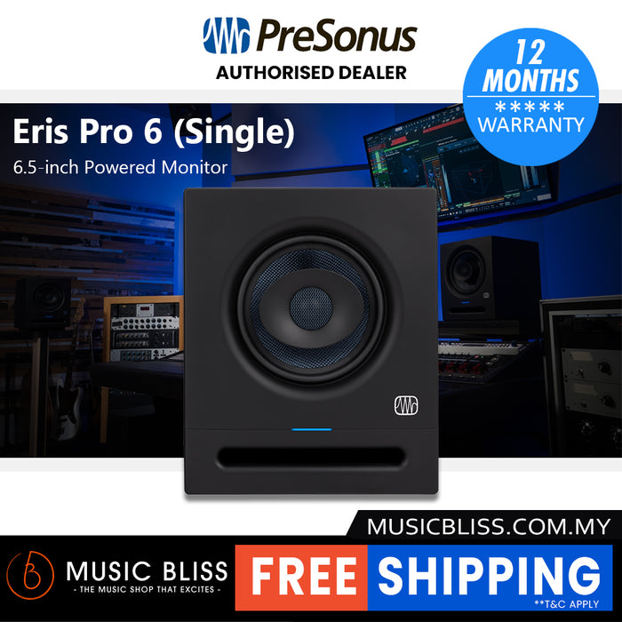 The PreSonus Eris Pro 6 represents the company's highest standard in home-scale and small-studio monitoring. This professional monitor comes with the same acoustic tuning controls as the other Eris Studio series monitors. It easily connects to the rest of your gear with a full complement of balanced and unbalanced inputs. Plus, enhanced circuitry and an improved single point-source coaxial design refine the Eris Pro 6's sweet spot tenfold, touting better phase alignment and a clearer sound overall. Benefit from 106dB of peak output via 140-watt, Class AB bi-amplification. You also get solid protection against RF interference, extreme output current, and excessive heat. There's also a handy Power Saver mode for more cost-effective use. Music Bliss recommends the PreSonus Eris Pro 6 for professional-level monitoring at a steal.