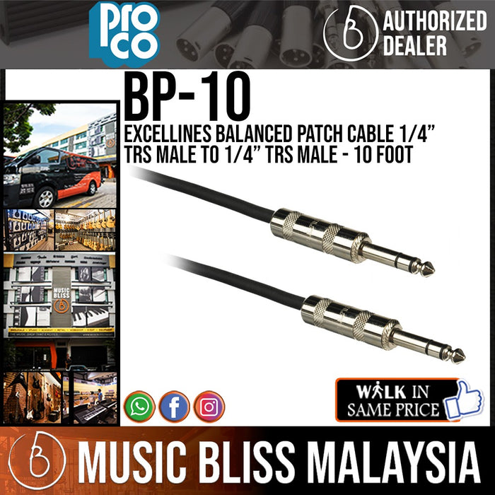 Pro Co BP-10 Excellines Balanced Patch Cable - 1/4-inch TRS Male to 1/4-inch TRS Male - 10 foot (BP10 / BP 10)