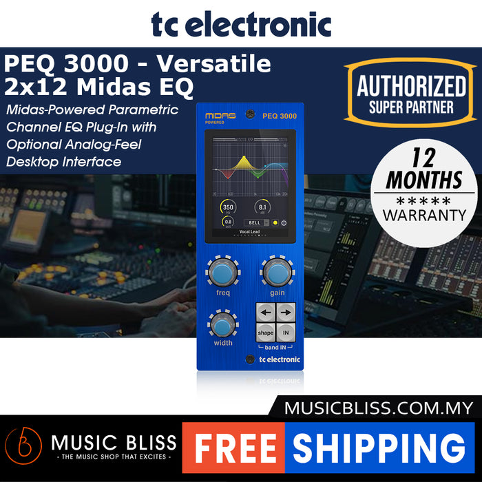 Add high-quality sonic sculpting to your DAW with TC Electronic’s PEQ 3000-DT. Based on the Midas HERITAGE 3000 console, this powerful 12-band parametric equalizer delivers warm sound and responsive performance via precise, analog-like controls. This flexible plug-in boasts stereo, M-S, and L/R modes, with fully parametric bell curves, filters, shelving responses, and linear-phase equalization. The PEQ 3000-DT is a versatile EQ plug-in. It works equally well on single sources, buses, and full mixes. You also get a resizable, high-resolution user interface. The PEQ 3000-DT includes a bus-powered hardware interface that offers tactile control and useful real-time visual feedback.