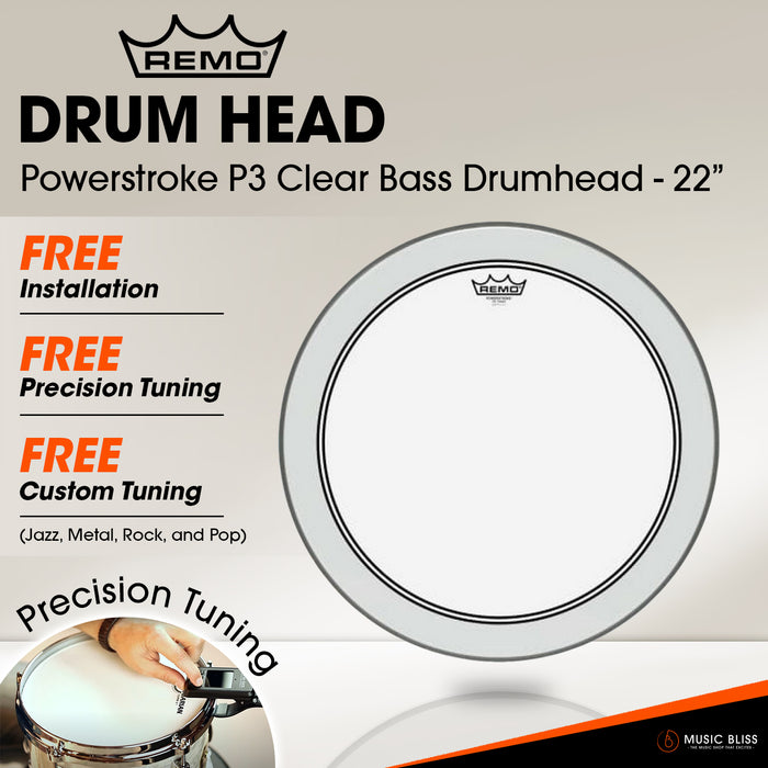 Remo's Clear Powerstroke 3 bass drum head gives you the balanced tone and punchy response you need! One of the world's most popular bass drum heads, the Clear Powerstroke 3 adds impressive bass to your kick drum, without overbalancing your kit. A thin outer-edge underlay gently dampens high frequencies, keeping your bass tone tight and focused. This particular version of the Clear Powerstroke 3 also features a white Falam patch, which does wonders to bring out the attack of your kick drum's beater. No matter what style of music you play, you're going to love playing with Remo's Clear Powerstroke 3 bass drum head.