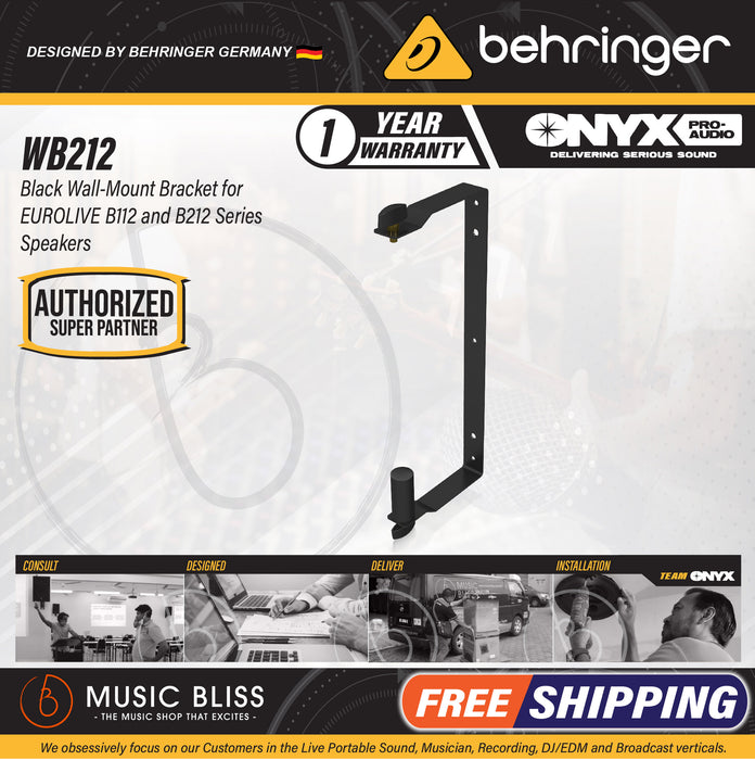 Mount your Behringer Eurolive B212 series PA speaker securely to any indoor wall with this purpose-built WB212 speaker bracket. Music Bliss Sales Engineers have been working with professional venues and organizations for decades, and we know how important balancing great sound and a comfortable environment can be. Made from extremely robust steel and coated to match your speaker, this Eurolive WB212 wall-mount speaker bracket blends right in with the decor of your theater, church, auditorium, or other live venue. It also provides a full 180-degrees of speaker rotation, so you can aim your speakers exactly where you need them.