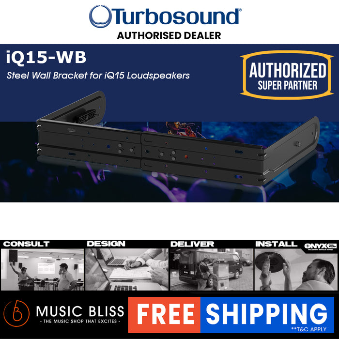 The iQ15-WB is a matt black, powder coated wall bracket specifically designed to hang the iQ15 in standalone applications, such as wall or ceiling mounting in bars or clubs, or as an under-balcony fill. The iQ15-WB consists of two yoke spacers, two yoke brackets and a bracket spacer, plus all the fasteners required for assembly. After the iQ15 is securely mounted and adjusted for the desired coverage, the screws attaching the enclosure to the bracket should be fully tightened to finalise the installation.