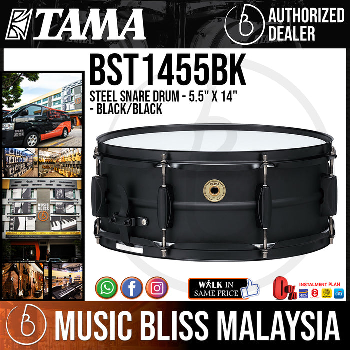 This steel snare drum offers a bright tone with a tight crispness in high-tuning and a smooth resonance in low-tuning. A 1.2mm matte black steel shell is processed to have a ridge on the center of the shell as reinforcement. The color of the shell hardware is matched to the matte black shell.