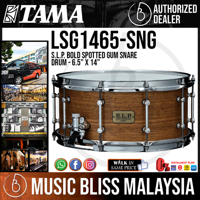 The LSG1465 "Bold Spotted Gum" snare drum features Spotted Gum wood, a hard and high-density wood growing in the Oceania area of Australia. The LSG1465 offers an extremely dry and solid sound without sacrificing the deeper low end. A Super Sensitive Hi-Carbon snare wire provides a crisp and articulate snare sound.