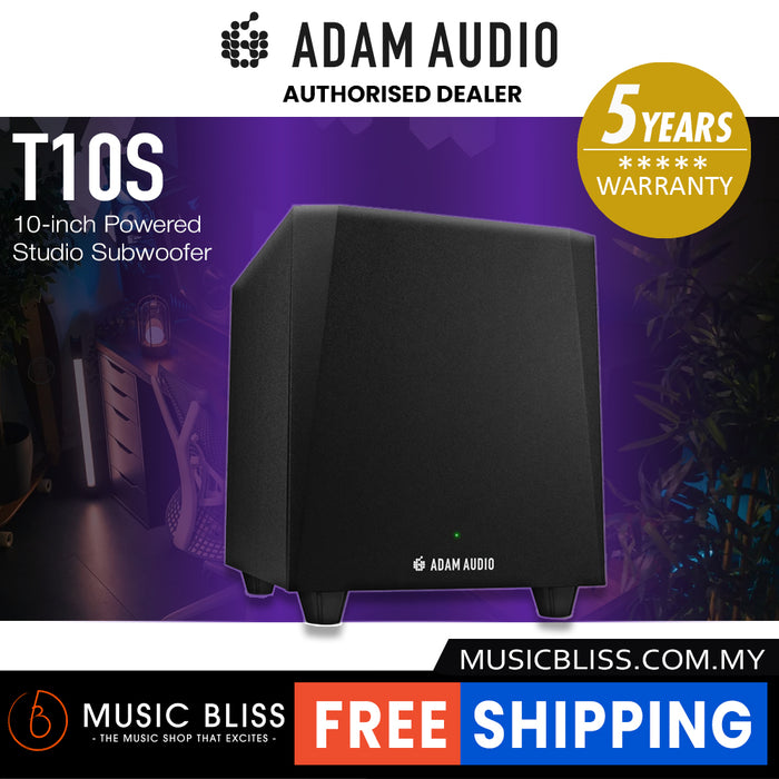 Designed to extend the bass response of the T Series, ADAM Audio’s affordable line of professional 2-way active studio monitors, the T10S Powered Studio Subwoofer delivers a max SPL of ≥104dB and rock-solid bottom end down to 28Hz (-6dB). Powerful yet compact, the T10S is driven by a beefy onboard 130-watt Class D amplifier. The T10S is fitted with a polarity invert switch and an internal crossover with three settings (80Hz, 120Hz, or Bypass), making it easy to integrate the sub with your mains and optimize for room acoustic and overall system performance in your room. ADAM Audio specifically developed the T10S to complement their T5V and T7V nearfield monitors, however, it also provides outstanding results when used with other compact satellite speakers.