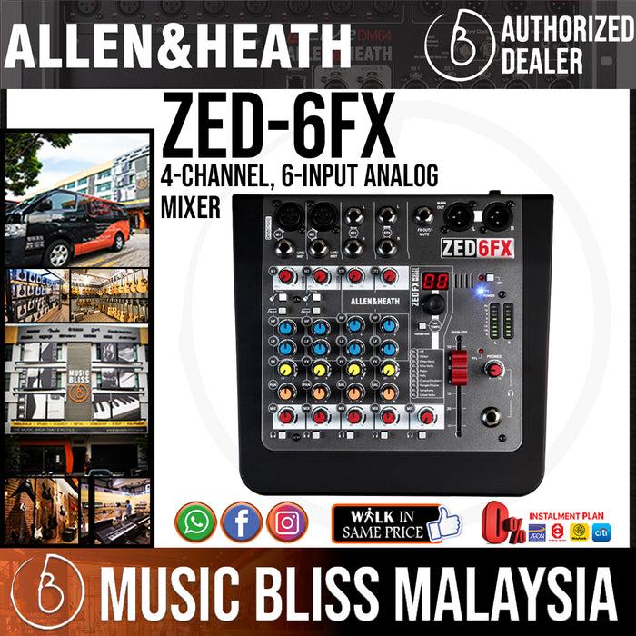 The Allen & Heath ZED-6FX 6-channel mixer offers great sound quality for small-format mixing applications. Two mono channels with acclaimed GSPre preamps are ready to accept mics (dynamic or condenser), instruments, or line-level sources. Two stereo channels are perfect for synths, drum machines, and other line-level sources. Add reverbs, delays, and combinations of the two with built-in effects processing. All this in a compact yet rugged design, with rotary controls secured to the front panel with a steel nut for maximum durability. For small PA and studio applications from schools and churches to corporate settings, the Allen & Heath ZED-6FX is a strong mixing solution.
