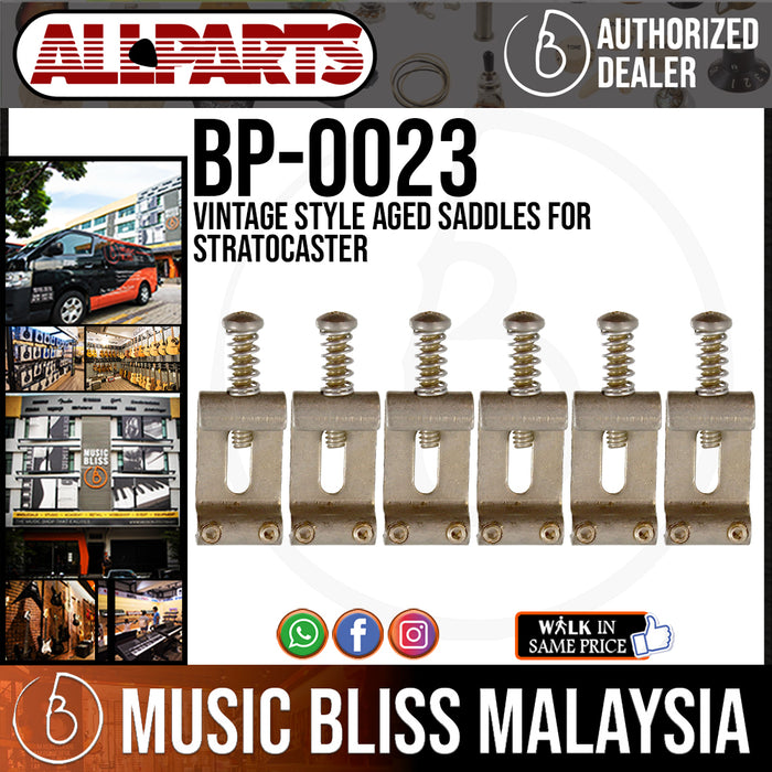 Vintage style stamped bent steel bridge saddles for Stratocaster®, with springs and screws. Set of 6 aged nickel finished saddles
