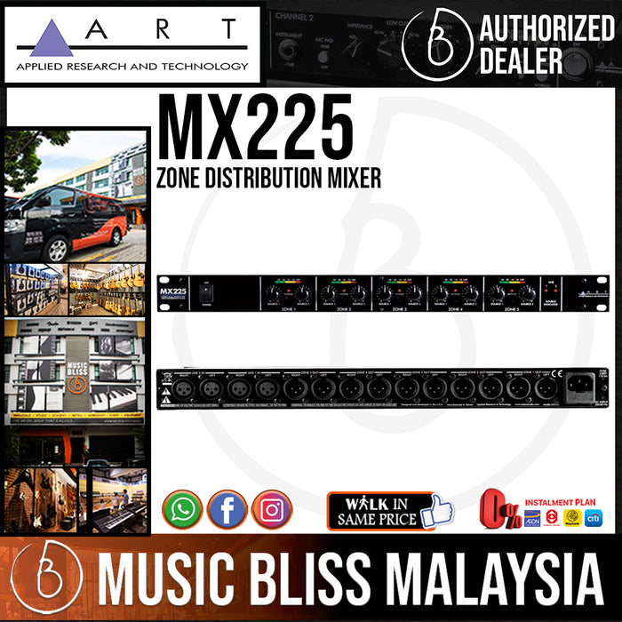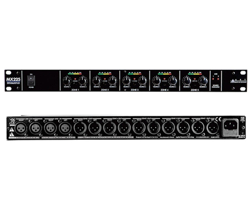 The MX225 is designed for remote volume control of multiple amplifiers or powered speakers in a distributed audio system. Two stereo sources are available to each of five output zones. Each source input pair handles separate left and right balanced line level signals. Each output zone features independent level control from inputs 1 and 2, stereo/mono selector with mono indicator, LED level metering, and left and right balanced line level zone outputs. All audio connections are balanced XLR. The built in power supply and single high 19″ rack mount format allows for easy installation and reliable operation.