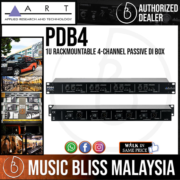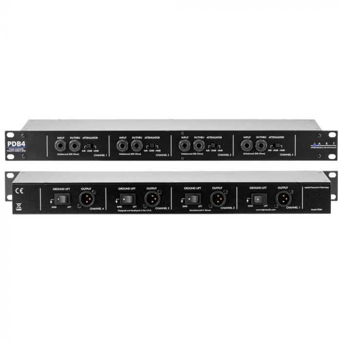 The PDB4 is a four channel passive direct box that features four fully transformer isolated direct boxes in a 1U 19-inch rack mount chassis. The inputs and outputs of each of the four channels are isolated to maximize channel separation, and transformer isolation on each output helps to eliminate system ground loops. It is a rock solid, roadworthy interface that is ideal for connecting outputs of electronic musical instruments (or other audio sources) to the balanced inputs of mixer consoles and other balanced audio products. The PDB4 also allows connection of a music source to an instrument amplifier while simultaneously patching it to a mixer.