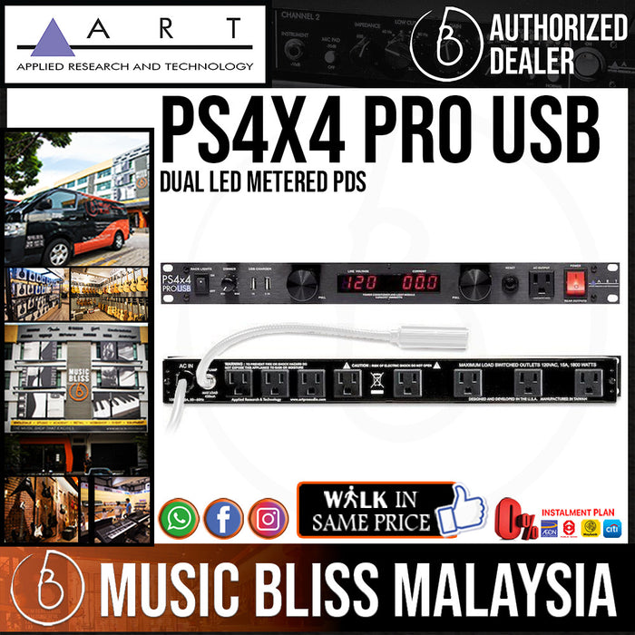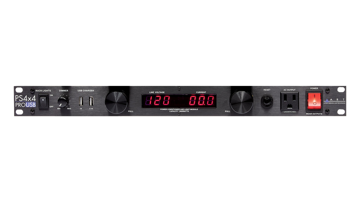 Safeguard your gear against power spikes and surges with the ART PS4x4 PRO USB. But that’s not all the PS4x4 PRO USB also employs ART’s Advanced Power Filtering, which minimizes unwanted noise. An easy-to-read input voltage/current metering display gives you at-a-glance confirmation that your system is safe. The PS4x4 PRO USB provides plenty of outlets for your gear: eight on its rear panel and one on its front, along with two USB charging ports. Pull-out lights illuminate the front panels of your gear, while a rear-mounted gooseneck light source makes it easy to see the connections behind your rack. The PS4x4 PRO USB has a power capacity of up to 1,800 watts.