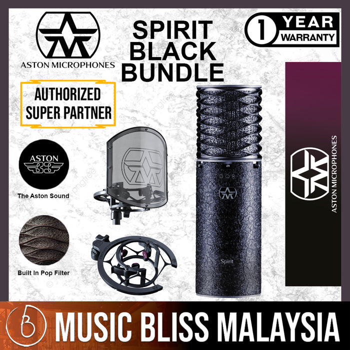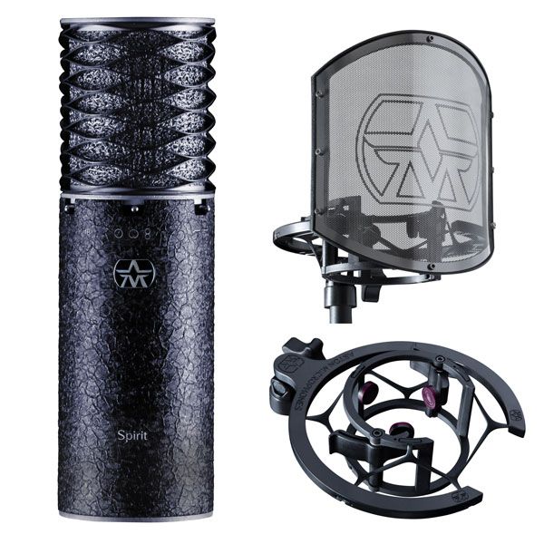 The Aston Microphones Spirit Black Bundle includes Aston’s flagship Spirit multi-pattern condenser mic, along with their Swiftshield shock mount and pop shield. The Aston Microphones Spirit is a unique-looking, high-performance large-diaphragm condenser mic with three selectable polar patterns and a 1" gold-evaporated capsule. Cardioid, omni, and figure-8 patterns, plus a 10/20dB pad and 80Hz highpass filter make this mic an all-around studio and stage workhorse. If you’re after quality on a budget, Aston Microphones’ Spirit is highly recommended.