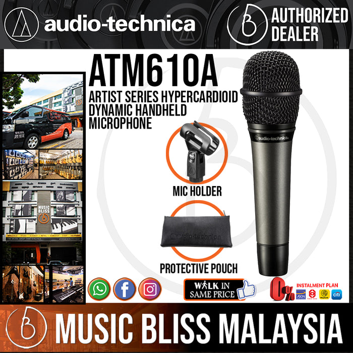 The ATM610 dynamic vocal mic is equipped with a rare earth neodymium magnet, a tight hypercardioid polar pattern and multi-stage grille design, and is tuned for clear, detailed, extended-range reproduction of lead and backup vocals, the premier Artist Series The microphone features an innovative dual-wall floating construction; the back-cavity assembly "floats" inside the handle shell, providing outstanding isolation from handling noise.
