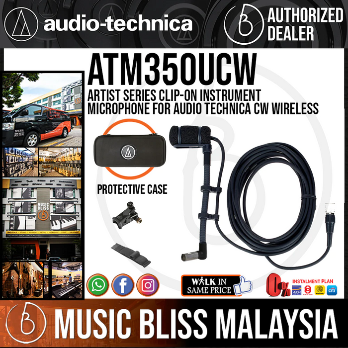 The Audio-Technica ATM350UcW clip mic package — compatible with A/T UniPak wireless transmitters — proves you don't have to sacrifice sound quality for wireless freedom. This low-profile, low-distortion condenser mic clips directly onto horns, drums, strings, and more, placing players directly in the sweet spot and eliminating clunky mic stands from your stage. The ATM350UcW includes two mount types to accommodate a wide range of instruments.