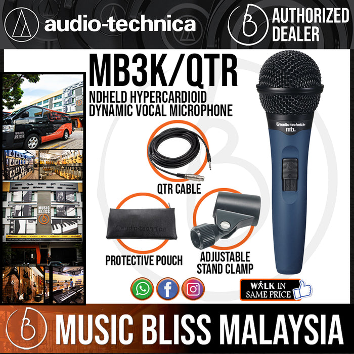 The Midnight Blues® Series standout performance microphone, the MB 3k/Qtr dynamic vocal microphone has an extended frequency response specifically developed to capture lead, backup, and choral vocals. Truly a standout in its class, the MB 3k/Qtr is tuned to make an impact: high volumes come through without distortion—and even subtle nuances are clean and precise. The microphone is supplied with a quater inch cable. Its Hi-ENERGY® neodymium magnet structure provides improved output and extremely fast transient response. Other features include A-T’s MagnaLock silent switch, soft-touch finish, and gold-plated XLRM connector.