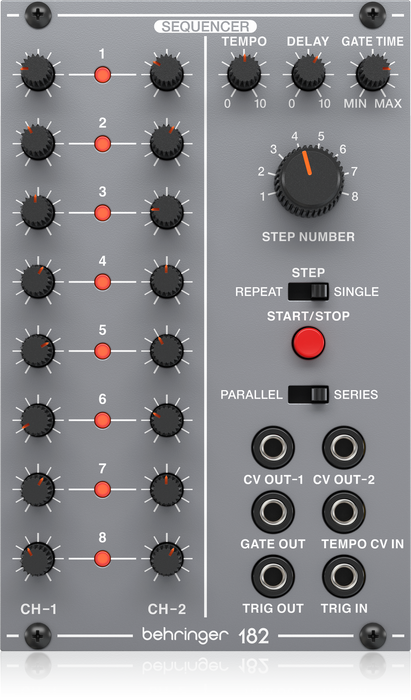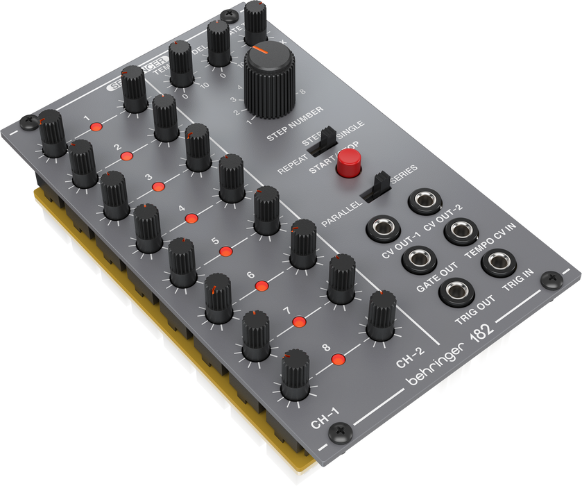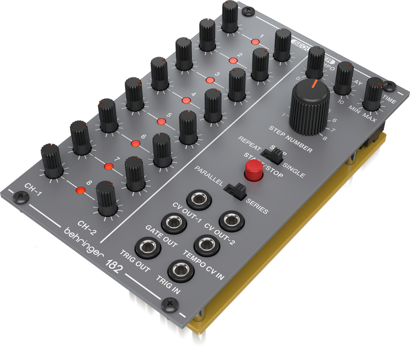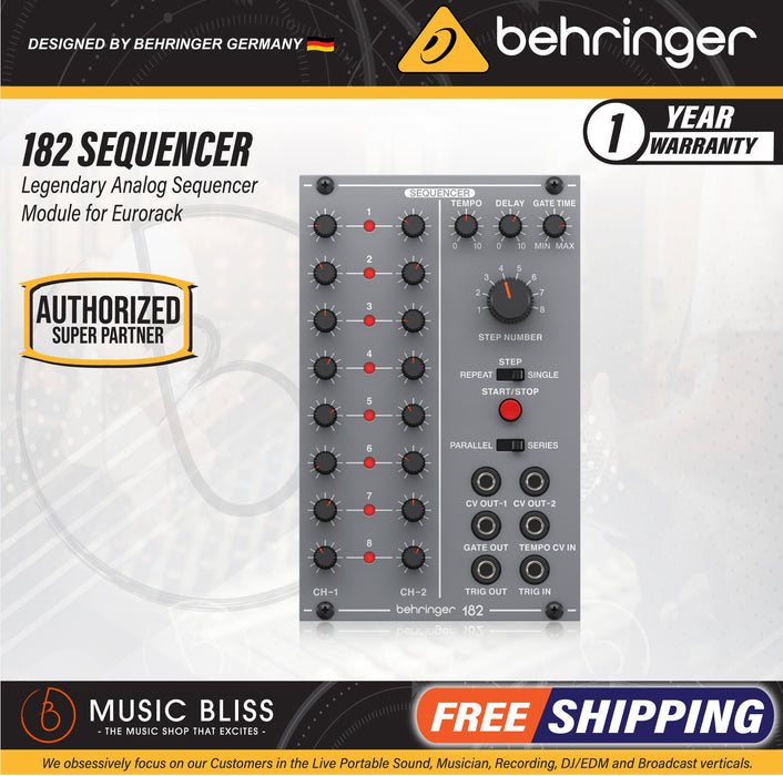Behringer 182 Sequencer is the beating heart of Behringer’s System 100 Eurorack module series. Boasting all-analog circuitry, this two-channel eight-step sequencer is perfect for programming Tangerine Dream-style synthwave ostinatos and pulsing Moroder-esque basslines. Each of the Behringer 182’s 8-step channels is routed to independent CV-outputs for running two sequences in parallel, which you can use to send contrapuntal melodies to two separate oscillators, create polyrhythmic patterns, or devise complex CV modulations synced to the same tempo. Alternatively, the Behringer 182 has an option for running the two channels in series for a single channel of 16-steps. You can control the tempo of sequences manually or via an external clock, and the Behringer 182 has a front panel Stop/Start button to launch and end sequences. A delay control acts as a portamento, setting the length of time it takes for a note to rise or fall; and a gate control lets you set the pulse width of the steps. Synthesists at Music Bliss dig this straightforward and affordable analog sequencer. Use it alongside the other Behringer System 100 modules or any of your favorite Eurorack and get transported back to the decade when analog synths ruled supreme!