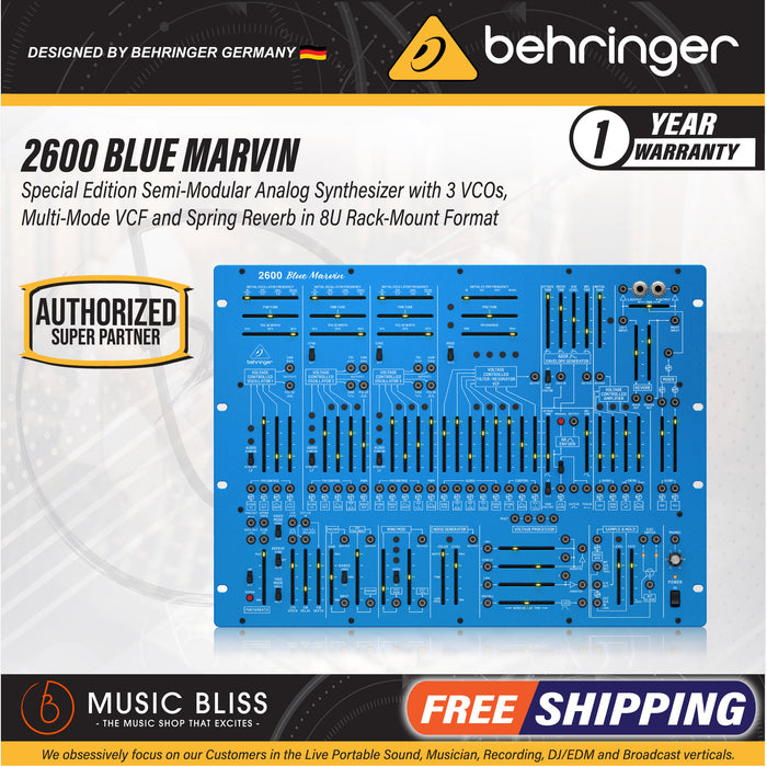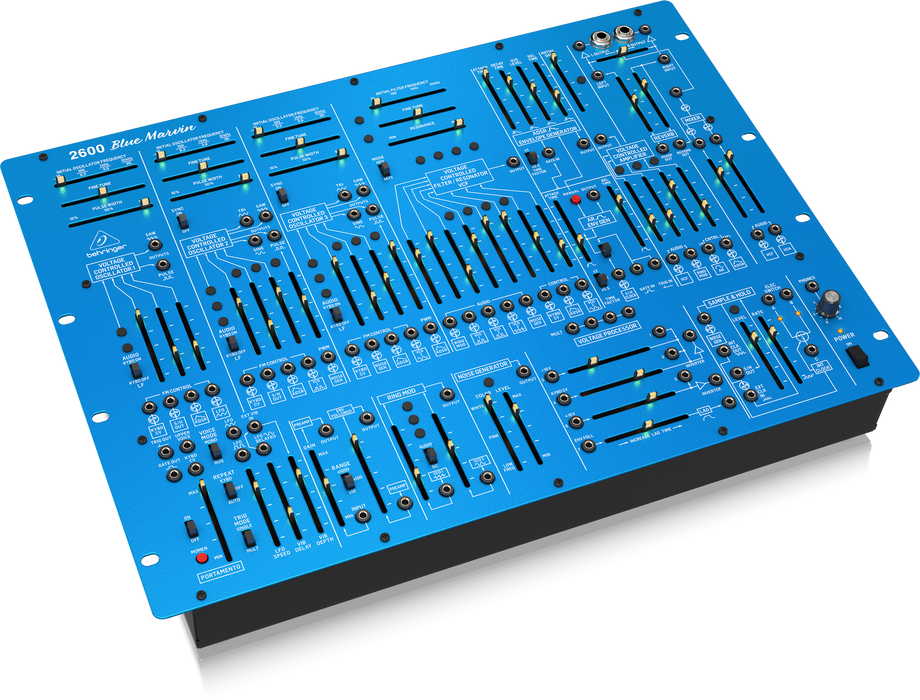 Few synthesizers are as celebrated as the original 2600, and now Behringer has brought the venerable semi-modular workhorse to the masses in an affordable 8U rackmountable format. Based on an ultra-rare early 2600 with a bright blue fit, the Behringer 2600 Blue Marvin leans into its normalled signal path and patch-point architecture to provide intrepid synthesists with a powerful sound creation platform. Whether you’re chasing classic synth sounds or concocting future-facing musical manifestations, the Behringer 2600 Blue Marvin arms you with a wealth of audio design tools, including three beefy VCOs, a multimode VCF, mountains of modulation, and inexhaustible routing options. With 78 faders and switches, 93 patch points, and Eurorack compatibility, the Behringer 2600 Blue Marvin has challenged synthesists at Music Bliss to tap out its creative potential. So far, we can’t, but maybe you can! Totally authentic and absolutely absorbing, the Behringer 2600 Blue Marvin is a sonic wonderland for analog aficionados and modular marauders alike.