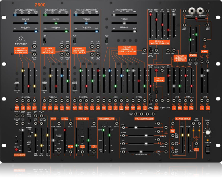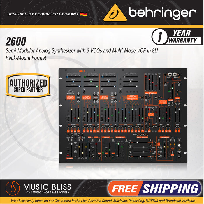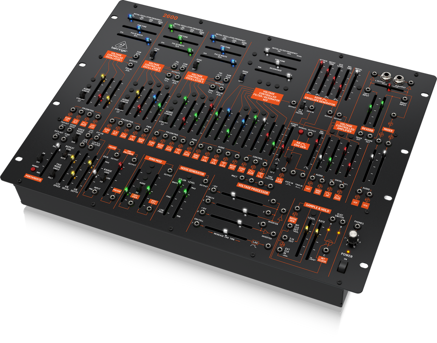 Few synthesizers are as celebrated as the original 2600, and now Behringer has brought the venerable semi-modular workhorse to the masses in an affordable 8U rackmountable format. Teeming with vintage vibe and old-school analog flair, the Behringer 2600 leans into its normalled signal path and patch-point architecture to provide intrepid synthesists with a powerful sound creation platform. Whether you’re chasing classic synth sounds or concocting future-facing musical manifestations, the Behringer 2600 arms you with a wealth of audio design tools, including three beefy VCOs, a multimode VCF, mountains of modulation, and inexhaustible routing options. With 78 faders and switches, 93 patch points, and Eurorack compatibility, the Behringer 2600 has challenged synthesists at Music Bliss to tap out its creative potential. So far, we can’t! Totally authentic and absolutely absorbing, the Behringer 2600 is a sonic wonderland for analog aficionados and modular marauders alike!