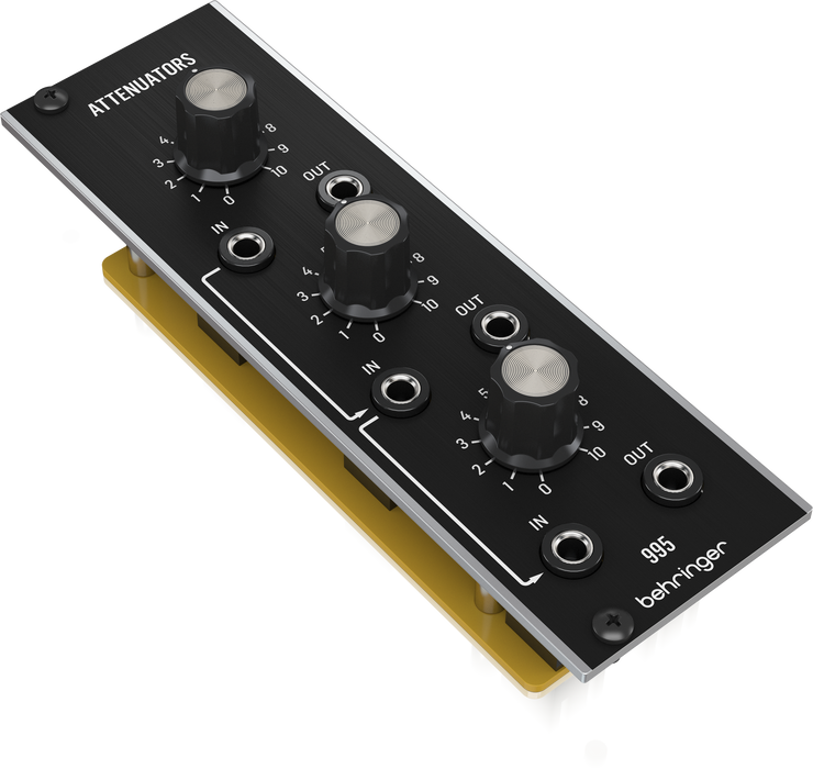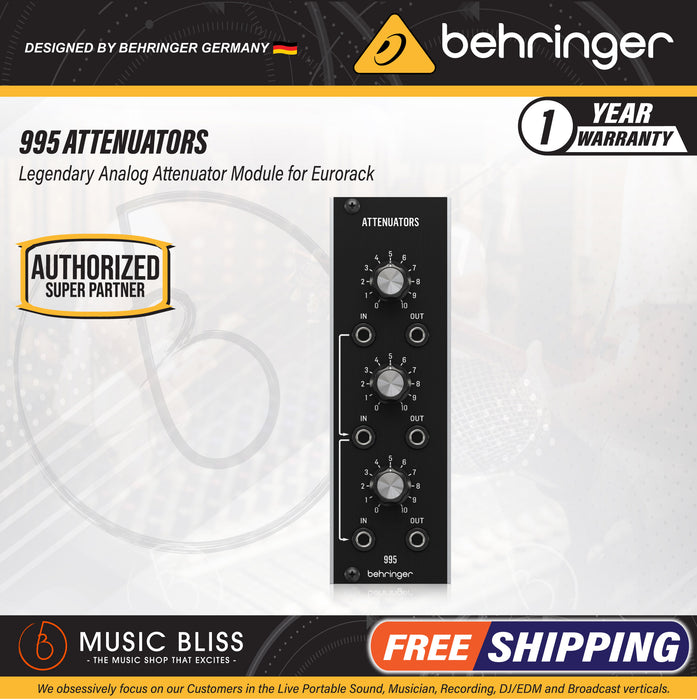 The Behringer 995 Attenuators module is a handy utility, sized for Eurorack. Used alongside Behringer’s System 55 and System 100 modules as well as third-party modules, the 995 lets you passively control the level of both audio and CV signals up to unity gain. The compact 8HP module contains three attenuators, which can be used in series to attenuate a single signal that can be sent to three different modules in your Eurorack system. Or, you can use it in parallel to attenuate and then output up to three independent input signals. Synthesists at Music Bliss are riding high on the Eurorack wave. And, they appreciate Behringer’s line of Eurorack modules for putting the power of modular synthesis into the hands of synth experts and synth newbies at a welcoming price.