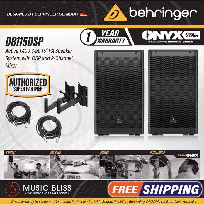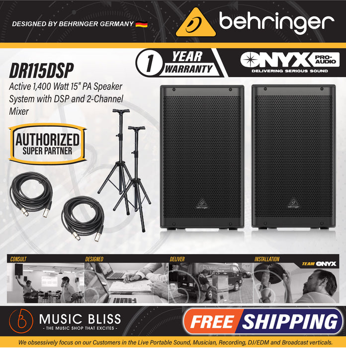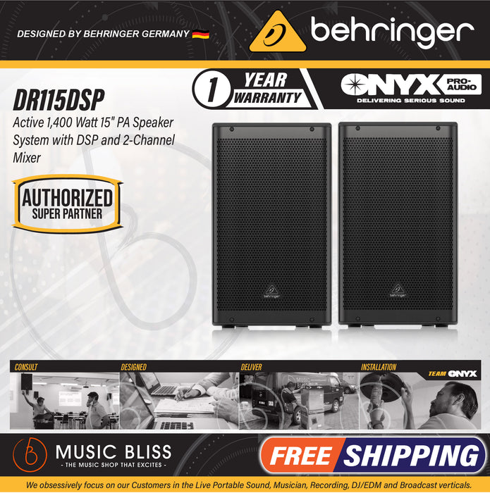 The Behringer DR115DSP is a cost-effective powered PA speaker that packs big sound and impressive features. The DR115DSP issues 1,400 room-filling watts from its 15" woofer and 1.75" compression driver. A virtually full-range frequency response (45Hz–19kHz) and wide dispersion pattern (90°H x 60°V) equip this speaker for critical FOH and public address applications. Not only that, but a versatile housing design allows the DR115DSP to be flown from trussing for permanent installations, mounted to a 35mm subwoofer pole for throw-and-go concert reinforcement, or even used as a wedge monitor for live performance feedback. A built-in 2-channel mixer with XLR-1/4" combo inputs let you use the DR115DSP even without a mixer — just plug in a mic or instrument, stream backing tracks wirelessly via Bluetooth, and you're all set to play out. Not only is the DR115DSP powerful and portable, but it's smart, too, giving you four sound profiles (Music, Live, Speech, and DJ/Club) and a built-in crossover for seamless integration with your room and gear. Dollar for dollar, if you're looking for output, portability, and ease of use at a great price, it's hard to beat the Behringer DR115DSP from Music Bliss.