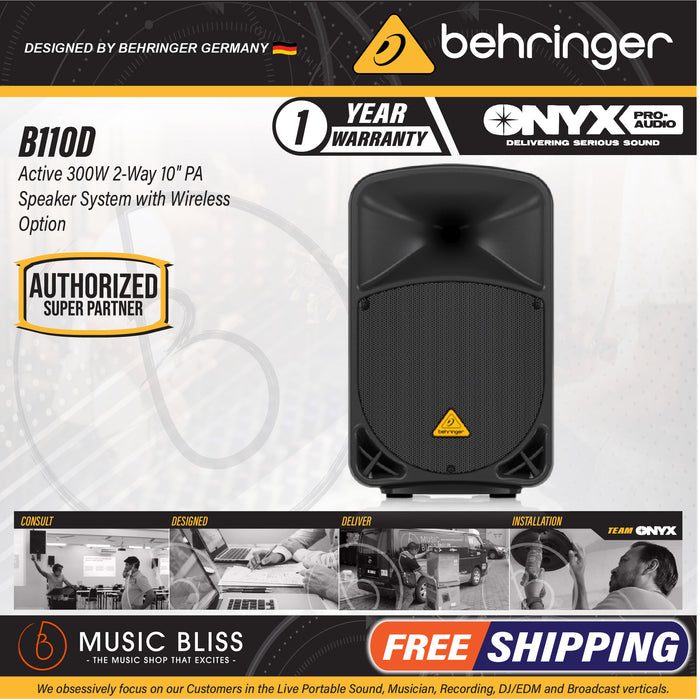 Thanks to its lightweight and super-compact design, the Behringer Eurolive B110D active PA speaker delivers excellent, low-distortion power and amazing versatility. Ideal for live sound, a portable PA, a monitor wedge, and house of worship applications, the B110D gives you the solid bass, crystal-clear high-frequency reproduction, and wide dispersion that you need. Wireless-ready with plenty of I/O, the B110D gives you the choice of an ultra-low noise mic or line input, as well as an additional line output for connecting multiple speakers. The Behringer Eurolive B110D active PA speaker makes sound reinforcement easy. Music Bliss Sales Engineers have put together countless live sound systems over the past three decades. Give us a call, we'll be glad to help you out!