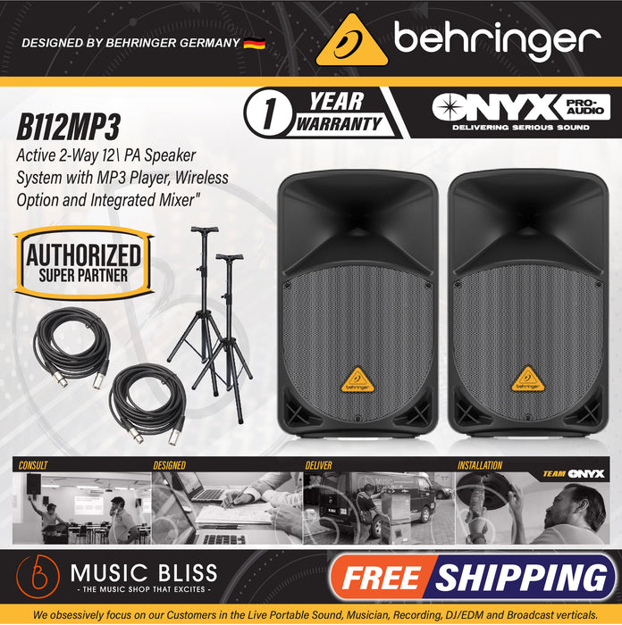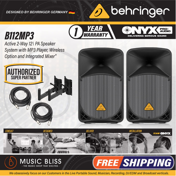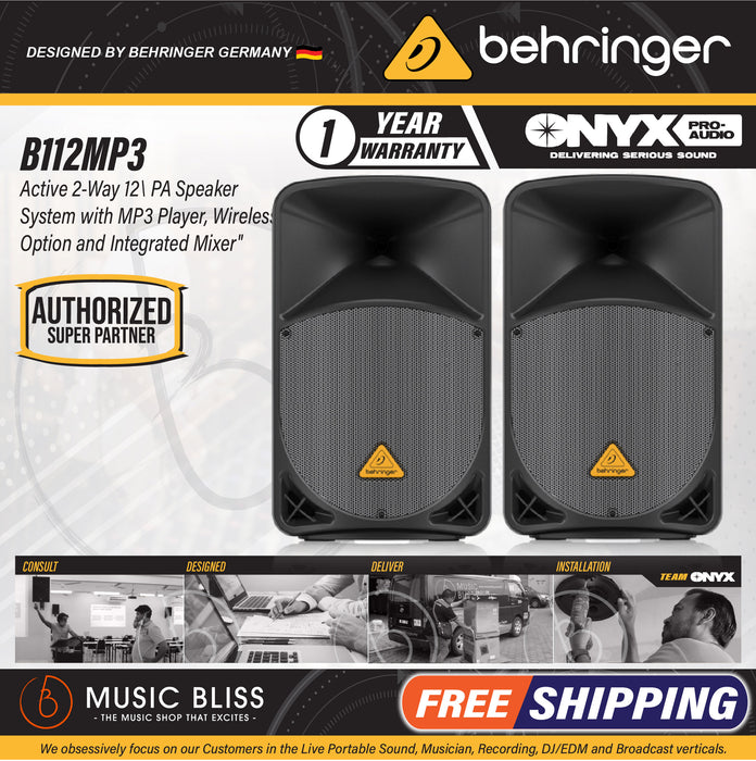 The Behringer EUROLIVE B112MP3 Active PA Speaker features state-of-the-art 1000 W Class-D power amp technology, built-in MP3 player and wireless microphone support and exceptional portability. The built-in Class-D power amp is backed by SMPS (Switch Mode Power Supply) technology, the high-tech alternative to heavy transformers and massive heat sinks.The EUROLIVE B112MP3 features a built-in MP3 player that, with its 8-button user interface and high-contrast, multi-function LCD panel lets you instantly browse tracks from your USB Stick (not included) and enable shuffle, repeat or single-play modes. From break and background music to high-resolution performance tracks, this full-feature MP3 player can handle it all. Until now, adding wireless microphones to a PA system meant either a mess of wires and dangling receivers or worse, a built-in receiver with dodgy performance and a hefty price tag. Just plug the receiver into the dedicated wireless port on the rear panel and you have full access to two channels of supremely stable, natural-sounding wireless connectivity.