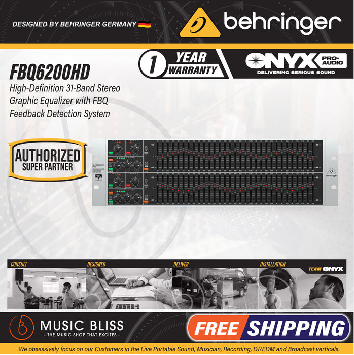 The Behringer Ultragraph Pro FBQ6200HD 31-band graphic equalizer is packed with the professional features you need. An FBQ Feedback Detection system quickly locates problem frequencies. A Planet Earth switching power supply yields noise-free audio, superior transient response, and efficient power consumption. Its 4580 dual op-amps exhibit low noise and excellent sound quality. The limiter on each of the Ultragraph Pro's channels protects your system from overload and distortion. Remove floor rumble, hiss, and other unwanted frequencies with sweepable highpass (low-cut) and lowpass (high-cut) filters on each channel. The Behringer Ultragraph Pro FBQ6200HD 31-band graphic equalizer is a great value for your studio or live sound rig.