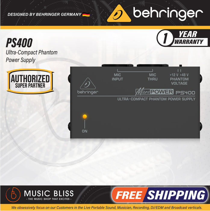 Need phantom power? Grab the Behringer MicroPower PS400 phantom power supply, and power up! Just plug in the included power supply, and you're ready to supply either 12V or 48V of phantom power to your condenser mic. Connect your condenser mic to the Mic Input and send a line from the Mic Thru to your mixer. If you need phantom power, look no further than the Behringer MicroPower PS400.