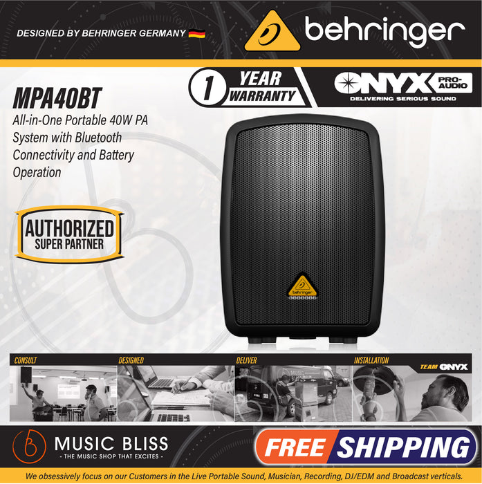 With a Behringer Europort MPA40BT portable PA system, you can get premium sound reinforcement anywhere you need it. This all-in-one PA system offers you grab-and-go convenience, plus the ability to run off of internal battery power for up to 12 hours. An 8" loudspeaker driven by a highly efficient 40-watt, class D amplifier provides more than enough volume for parties in the park, lectures in the cafeteria, or coffee shop gigs. In addition to two microphone inputs, the MPA40BT's 4-channel built-in mixer offers Bluetooth streaming and compatibility with Behringer's ULM digital wireless systems. Talk about convenience! Order your Behringer Europort MPA40BT today!