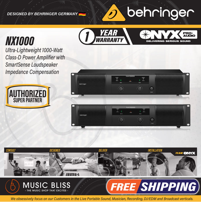 The Behringer NX1000 packs an impressive amount of power into a lightweight, cool-running unit. This power amplifier delivers 300 watts/channel into 4 ohms, 500 watts/channel into 2 ohms, or a whopping 1,000 watts into 4 ohms bridged, so you'll have plenty of headroom to work with. Experience low noise, superior transient response, and low power consumption, thanks to an efficient switch-mode power supply. Benefit from a linear frequency response at any speaker load, by virtue of the NX1000's SmartSense loudspeaker impedance compensation. Beyond that, Zero-attack limiters supply maximum output with reliable overload protection. The NX1000 comes complete with a built-in stereo crossover, reliable twist-lock speaker connectors, and precise 4-segment LED metering.