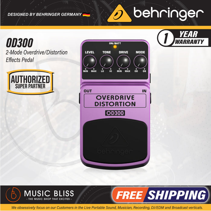 Overdrive, or distortion? Get both, with the Behringer Overdrive Distortion OD300 pedal! Use the mode dial to explore a range of tone, from slightly edgy overdrive to full-on raging distortion. Whether you play with humbuckers or single-coil pickups, the tone knob lets you fine-tune just how much bite and brightness your tone has. Guitarists at Music Bliss consider any pedalboard incomplete if it doesn't have some type of overdrive or distortion on it. You can have both, with the Behringer Overdrive Distortion OD300!
