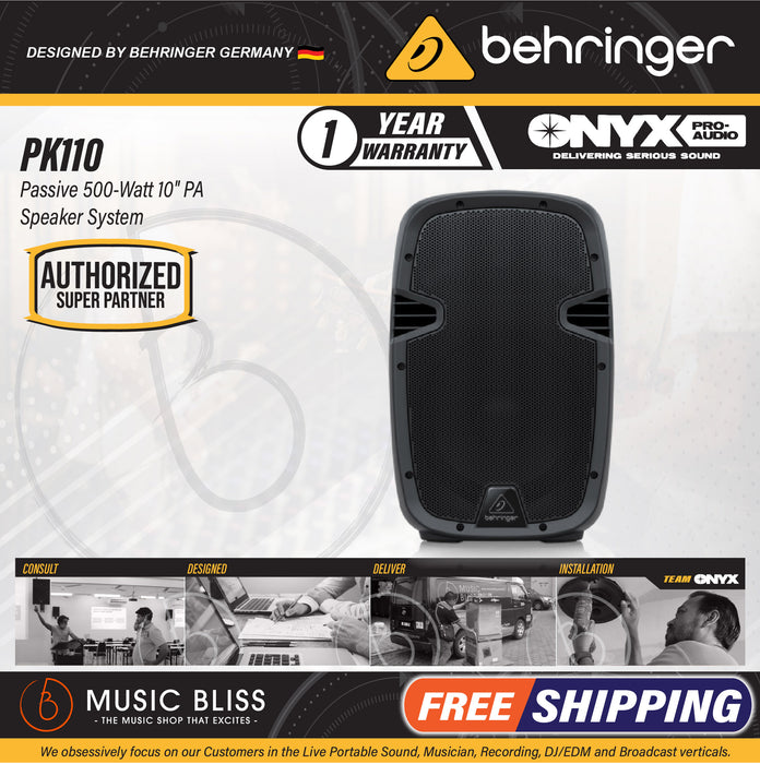 The Behringer PK110 is proof that top-quality sound doesn't have to cost a small fortune. This high-efficiency passive PA loudspeaker really shines across a variety of applications, from event setups to permanent installs. Its custom-tuned speaker complement — a 10-inch woofer with a 1-inch HF driver — provide up to 480 watts of peak power and uniform 70° x 50° dispersion to all listeners on your floor or in your sanctuary. You've got twist-type 4-pin speaker jacks to support your locking speakON cables. There's even a Link Output for chaining multiple speakers off from one another, which is great for eliminating long cable runs and maximizing the reach of your power amp. And thanks to its compact size and low weight, the Behringer PK110 is a breeze to pack up and rig up on a truss.