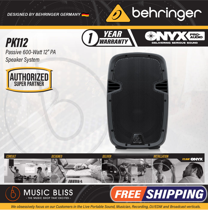 The Behringer PK112 is proof that top-quality sound doesn't have to cost a small fortune This high-efficiency passive PA loudspeaker really shines across a variety of applications, from event setups to permanent installs. Its custom-tuned speaker complement — a 12-inch woofer with a 1-inch HF driver — provide up to 600 watts of peak power and uniform 70° x 50° dispersion to all listeners on your floor or in your sanctuary. You've got twist-type 4-pin speaker jacks to support your locking speakON cables. There's even a Link Output for chaining multiple speakers off from one another, which is great for eliminating long cable runs and maximizing the reach of your power amp. And thanks to its compact size and low weight, the Behringer PK112 is a breeze to pack up and rig up on a truss.