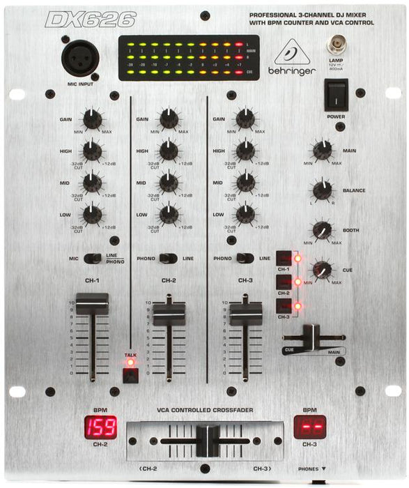 The Behringer Pro Mixer DX626 3-channel DJ Mixer has a powerful feature set that DJs of all levels will love. The DX626's spacious layout lets you worry about keeping the party going instead of hunting for buttons and functions. Each channels sports a 3-band EQ so you can sculpt the perfect sound. At Music Bliss we know that DJs need a mixer with lots of inputs, and the DX626 has what you need. You three RCA inputs for line or phono, three sets of RCA outputs, and a smooth VCA-controlled crossfader. With all this, it's no wonder so many DJs have made the Behringer Pro Mixer DX626 the center of their rig.