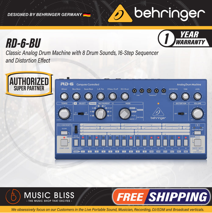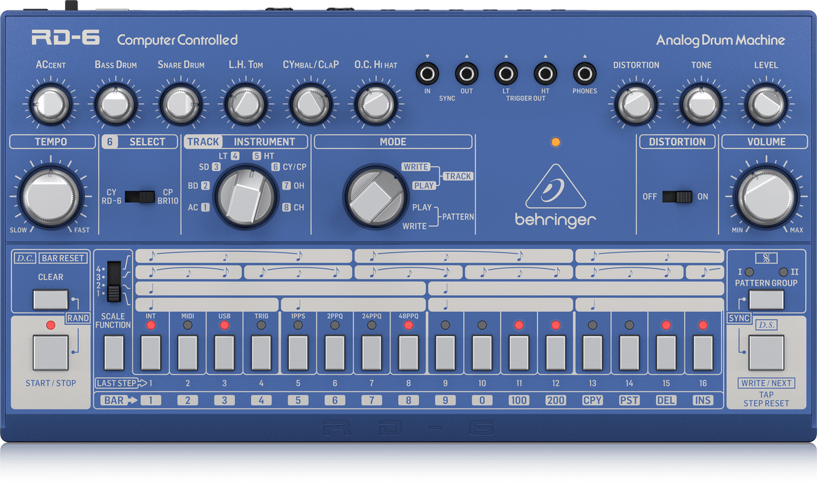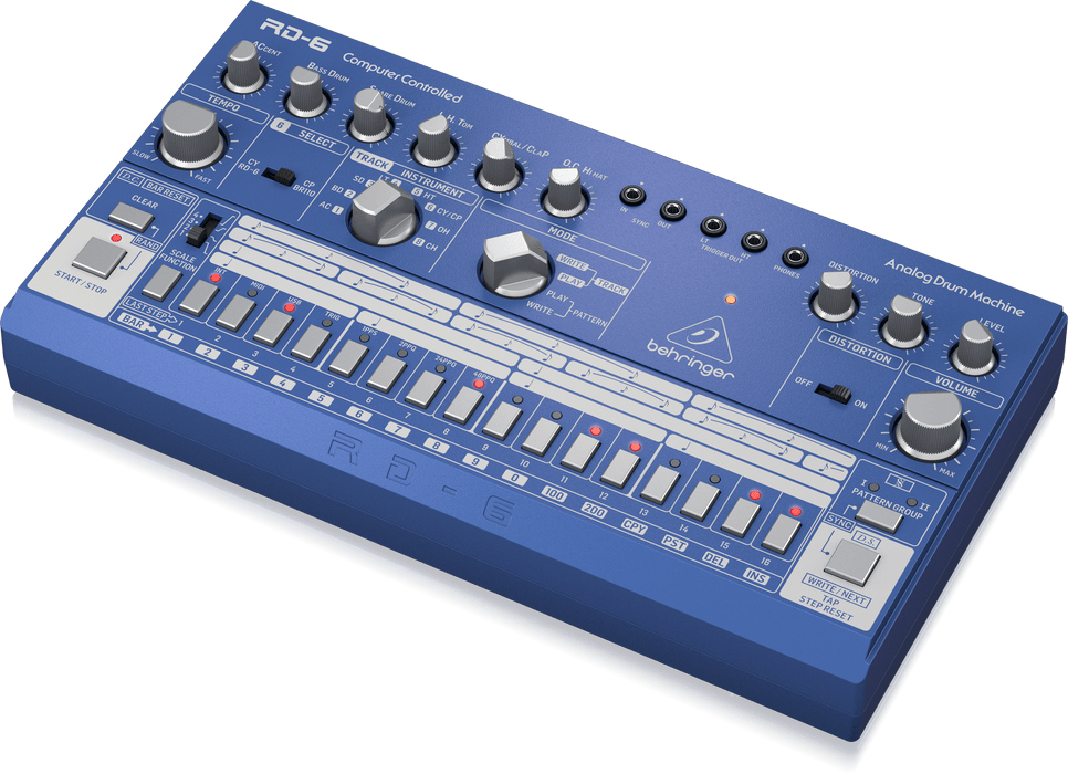 Loaded with eight analog drum voices derived from the classic 606 drum machine, the Behringer RD-6 analog drum machine combines iconic '80s drum machine sounds with modern USB and MIDI connectivity. Use the 16-step drum sequencer to create your grooves, with seamless real-time switching between up to 32 patterns. For longer sequences, you can chain patterns into full songs with up to 250 bars. And with trigger outputs to control your other modular and semi-modular synthesizers, the Behringer RD-6 is the perfect way to bring old-school analog drum sounds into your modern synthesizer rig.