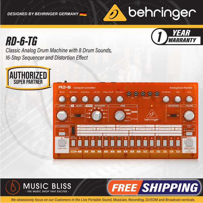 Loaded with eight analog drum voices derived from the classic 606 drum machine, the Behringer RD-6 analog drum machine combines iconic '80s drum machine sounds with modern USB and MIDI connectivity. Use the 16-step drum sequencer to create your grooves, with seamless real-time switching between up to 32 patterns. For longer sequences, you can chain patterns into full songs with up to 250 bars. And with trigger outputs to control your other modular and semi-modular synthesizers, the Behringer RD-6 is the perfect way to bring old-school analog drum sounds into your modern synthesizer rig.