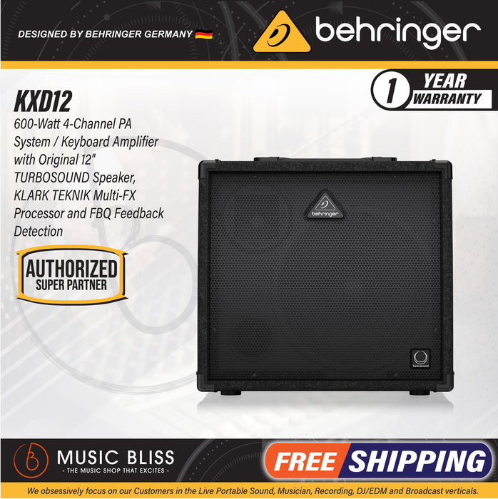 The Behringer KXD12 keyboard amplifier joins their popular Ultratone line providing powerful sound and onboard effects at 600 watts. This versatile keyboard amp comes loaded with a 12" Turbosound speaker and a 1" high-frequency driver. A full 4-channel stereo mixer with a 7-band graphic EQa FBQ feedback detection system and a Klark Teknik effects processor with 100 presets completes the picture offering you full on-the-go PA functionality.