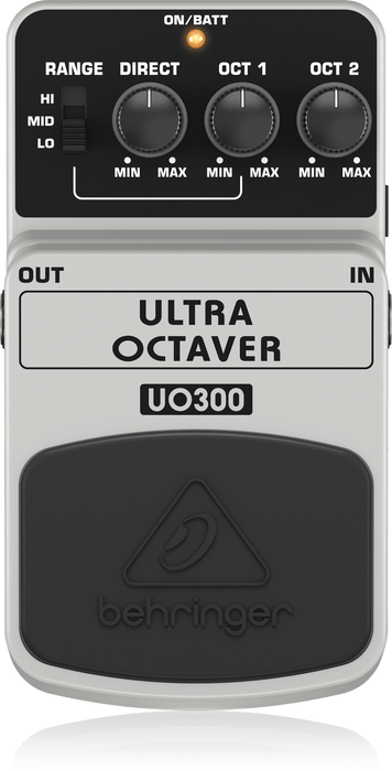Create classic layered guitar tones with the Behringer Ultra Octaver UO300 guitar and bass effects pedal. At Music Bliss, we dig funky tone machines such as the iconic octaver, and this Behringer UO300 offers this quintessential stompbox effect along with a few tweaks that make it easy to dial in perfectly. For starters, a 3-mode range control with Hi, Mid, and Lo settings lets you define the range of your instrument for optimal performance with guitar or bass. Also, the Ultra Octaver's independent volume controls for both octave voices as well as the unaffected direct signal lets you create the exact effect you're going for.