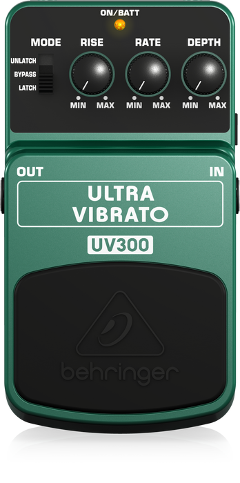 It just doesn't get any groovier than a classic vibrato guitar effect, like the Behringer Ultra Vibrato UV300. This classic vibrato effect gives you the ability to call up anything from mild and mellow detuning to the mind-bending, high-speed modulation that makes you think of creature features and psychedelic rock solos, making it one of the cooler effects of its kind you'll find at Music Bliss. In addition to the Depth and Rate controls, which let you dial in the overall sound of the UV300's effect, you also get a Rise control, which determines how fast the full detuning kicks in. This is particularly cool when you run your UV300 in Unlatch mode, which lets you step down to temporarily kick in the effect, rather than toggle it on or off.
