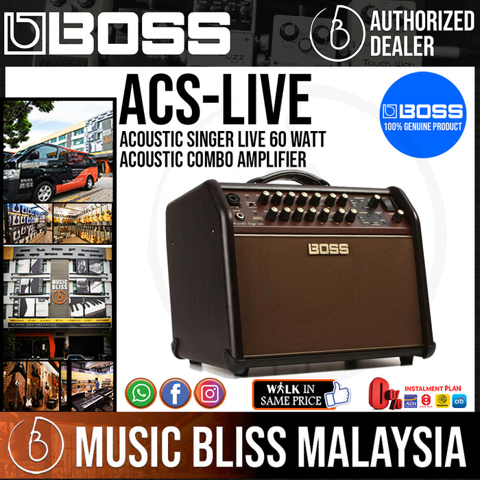The BOSS Acoustic Singer Live brings the convenience of the full-powered Acoustic Singer Pro to a smaller,lighter more affordable unit. Just add a guitar and a mic to take your music on the road. From the subway to the concert hall this amp has the power depth and features to transform your set into an engaging audience experience. Its 60 watts and custom 2-speaker cabinet reproduce the fullness of your voice and instrument among the backdrop of a small combo. And a host of luxurious features from switchable automatic vocal harmonies to a looper section and FX make the BOSS Acoustic Singer Live an essential tool for solo artists. Send both channels ? dry and wet ? to your FOH while simultaneously capturing your performance via the built-in USB audio interface for your followers who couldn make it.
