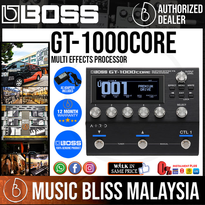 The BOSS GT-1000CORE manages to pack the full processing power of BOSS's flagship GT-1000 floor processor into a compact throw-and-go gigging format. Inside awaits a bevy of quality amp, cab, and effects models for your stage and studio needs. The GT-1000CORE has all your bases covered, from industry workhorses to exotic boutique builds and high-concept stereo amp/FX fusions that are perfect for building atmosphere. Its 32-bit/96kHz processing supplies faithful modeling and a familiar feel that will have the guitar and bass player in you wondering where the amp is. Factor in 24 simultaneous assignable FX blocks, AIRD-driven guitar and bass preamps, stereo inputs for seamless pedalboard integration, two FX loops for running four-cable amp method, and USB direct out for fuss-free recording, and the BOSS GT-1000CORE earns its place among the most distinguished mini amp and FX processors in the Music Bliss catalog.