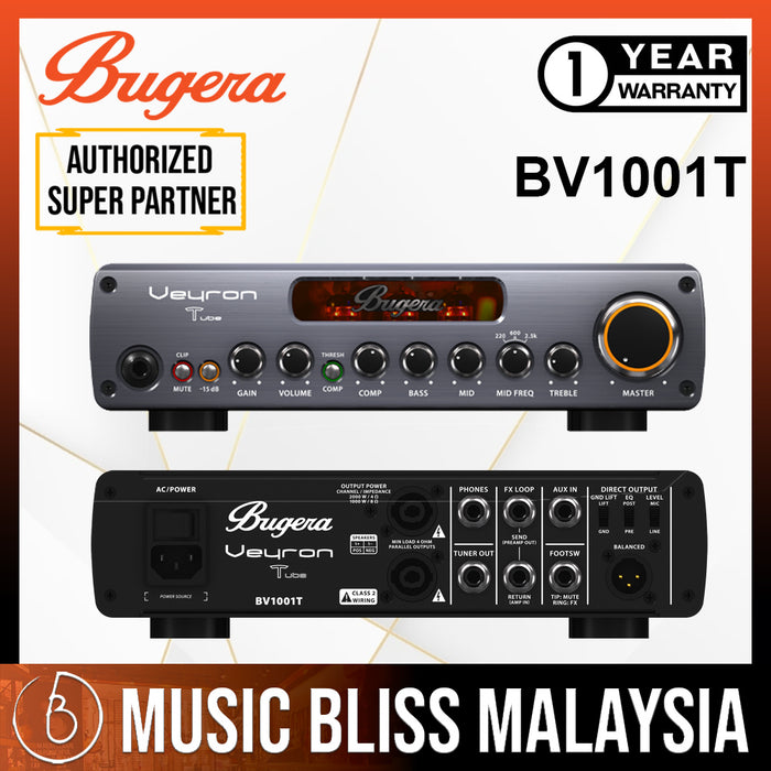 Huge on power, the Bugera Veyron T BV1001T bass head rocks a whopping 2000 watts while keeping the weight down thanks to the high-efficiency Class D power amp. The preamp is driven by a trio of 12AX7 tubes, which imparts a classic tube warmth to your tone. Getting to gig should be no problem, thanks to the convenient built-in carrying handle. When you're at the gig, the footswitchable FX loop simplifies your onstage setup, and the dedicated balanced DI makes it easy to connect to the soundboard. And this just scratches the surface of the Bugera Veyron T BV1001T bass head's features!