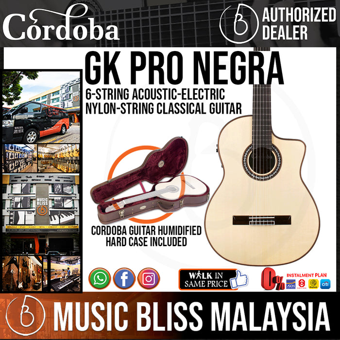 The Cordoba GK Pro Negra Gipsy Kings signature model nylon-string acoustic guitar combines a fast-playing feel with traditional flamenco construction techniques for a remarkable playing experience. The GK Pro Negra is built for tone, with solid Indian rosewood back and sides with a solid European spruce top. The mahogany neck is slightly thinner and narrower than traditional classical guitars for smooth playability. And the thinner body style is comfortable for players of any style. Not only do you get premium tonewoods, the GK Pro Negra shows Cordoba's attention to detail with a hand-inlayed wood rosette and premium gold tuners. You also get the Fishman Prefix ProBlend pickup system built right in. For a highly playable guitar with some beautiful appointments, you'll love the Cordoba GK Pro Negra.