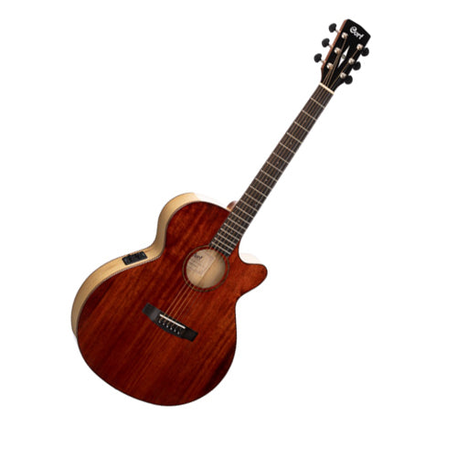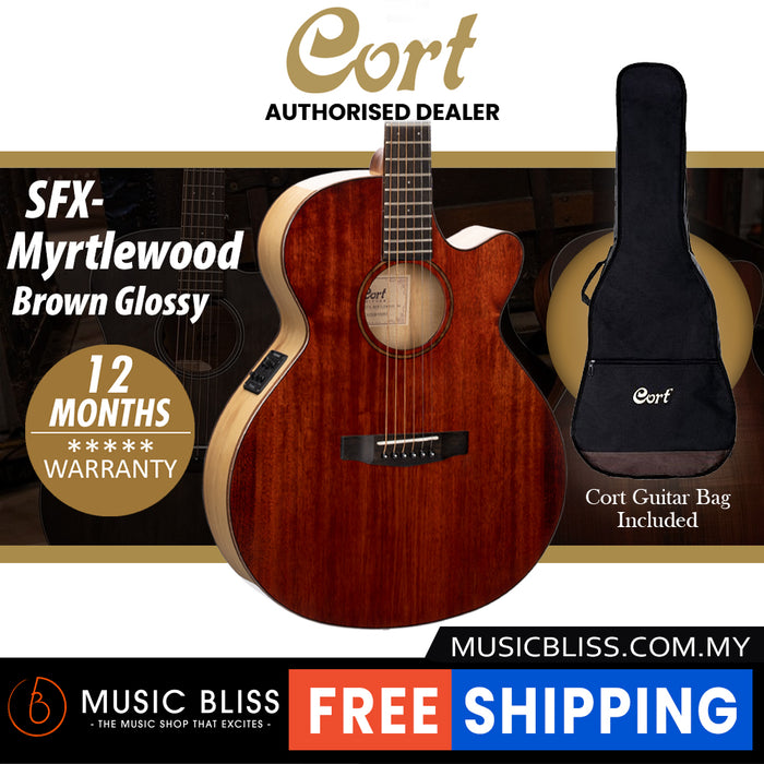 As Cort’s vision of the modern acoustic-electric, the SFX Series features Cort’s own unique slim body shape (83-83mm) with comfortable cutaway, modern V-shape neck profile and jumbo frets for enhanced playability, arched back for improved resonance, and Fishman electronics. The use of exotic wood Myrtlewood gives SFX Myrtlewood a unique look that stands out from rest of the series while enabling it to produce the bright and clear sound with clear sound projection.