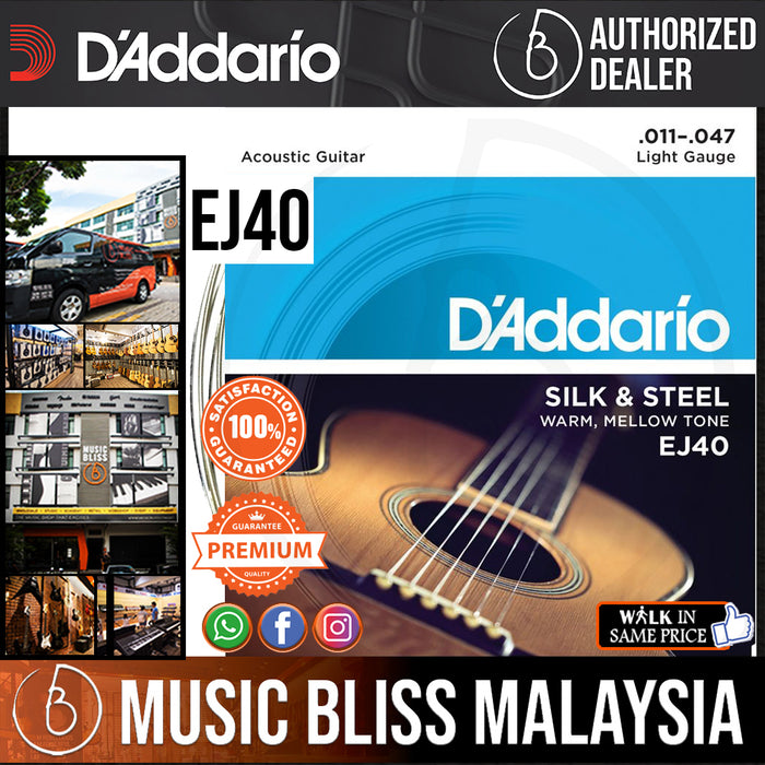 By coupling silver-plated copper wrap wire with silk, D'Addario EJ40 Silk and Steel acoustic guitar strings produce a warm, mellow tone that's ideal for fingerstyle playing. Music Bliss knows that choosing the perfect string is vital to a musician's sound. Excellent for smaller body acoustic guitars, EJ40 Silk and Steel acoustic guitar strings are preferred by many folk guitarists.