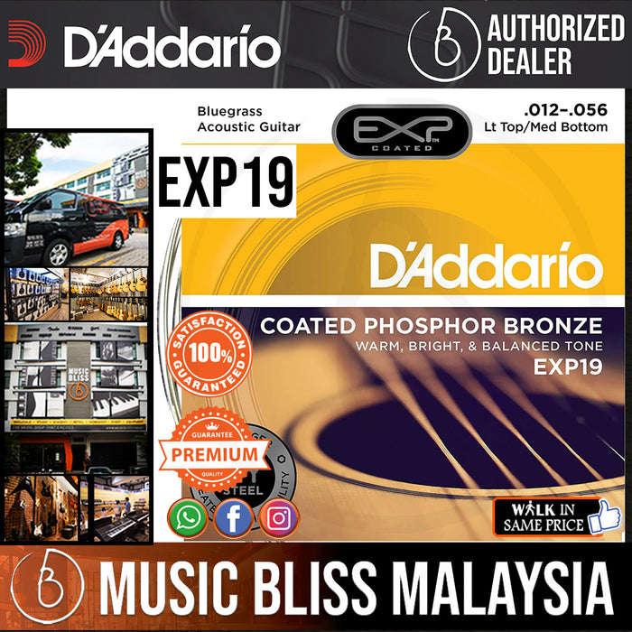 EXP19, a D'Addario hybrid gauge, combines the medium gauge bottom strings for increased resonance and volume with light gauge top strings for more comfortable playability and single note bending. A popular choice for bluegrass pickers but suitable for many genres.