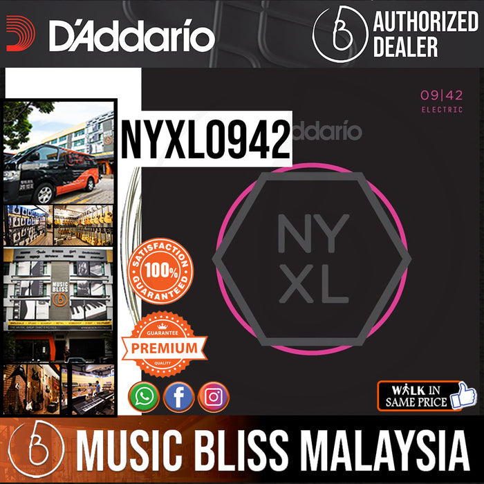 Hard on electric guitar strings? Music Bliss guitarists are excited about D'Addario NYXL strings because they sound great, bend farther, and stay in tune better - even after a couple of sweaty gigs - than just about anything else we've played. D'Addario uses a high carbon steel core with a unique "fusion twist" process for the plain strings. NYXL's reformulated nickel plated string windings have increased magnetic properties that give you higher output and juiced midrange for greater presence and crunch. If you're dissatisfied with your electric guitar strings, give D'Addario NYXL strings an audition. You'll be impressed.