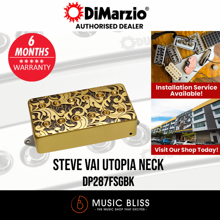 Culled directly from Steve Vai’s signature Ibanez PIA guitar, the DiMarzio UtoPIA neck humbucker is voiced for a warmer, richer tone than its bridge counterpart. This pup delivers bold lows and robust highs. In fact, at Music Bliss, we’ve found that this humbucking pickup’s amazing low-end response adds muscle and body to every note you play. Beyond that, the pickup’s upper mids are dialed back to produce a slightly subdued attack, while giving you an extreme level of control. The UtoPIA includes an attention-grabbing laser-cut baroque-style pickup cover.