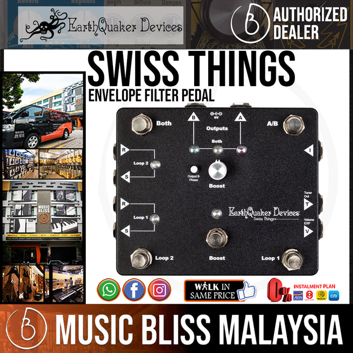Looking for an effects pedal loop switcher that actually leaves some space on your pedalboard for your effects pedals? Check out the EarthQuaker Devices Swiss Things Pedalboard Reconciler. There's a lot going on here Swiss Things combines two true bypass, Flexi-Switch enabled effects loops, AB-Y functionality (with transformer-isolated outputs), a buffered tuner output, a 20dB clean boost, and an expression pedal jack for volume control. One effects loop is unbuffered for best operation with fuzzes and other finicky pedals, the other effects loop is buffered and intended for reverbs, delays, and other time-based effects. With this many routing options and handy functions, the EarthQuaker Devices Swiss Things Pedalboard Reconciler may be the key to creating your ideal pedalboard rig.