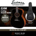 The E2OM acoustic guitar by Eastman Guitars has everything that an advancing player or even a professional could desire. Solid cedar and sapele tonewoods give this guitar a thoroughbred sound that teems with richness and musicality. The versatile “C” profile of the E2OM’s mahogany neck helps players readily explore a glassy ebony fingerboard. What’s more, elegant appointments and the natural beauty of hardwood emphasize good looks to a degree that’s virtually unheard of in this price range. Beyond a solid top and solid back and sides, the E2OM acoustic guitar is fitted with a bridge, bridge pins, and saddle, all carved from ebony. The body is framed with tortoiseshell binding and a deluxe soundhole rosette that complements a Truetone finish, the E2OM’s final touch that adds a thin, durable seal while letting tonewoods vibrate and breathe at full force.